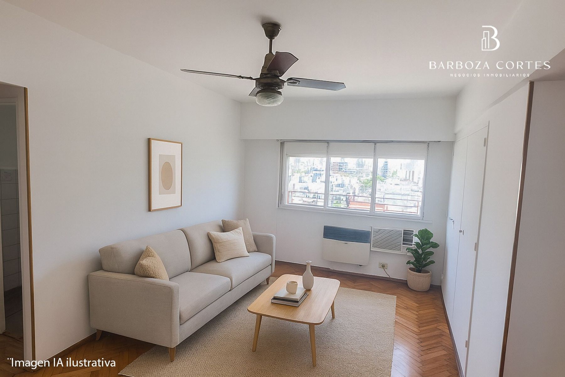 Departamento Luminoso y Silencioso, ubicado en un piso 12 con vista abierta, cocina independiente con conexión para lavarropas, SE ENTREGA RECIEN PINTADO, 3 aires acondicionados, calefacción por estufa, pisos de madera pulido, baño completo. En la terraza hay un espacio para el colgado de ropa para cada departamento, ademas en la entrada hay espacio para el guardado de bicicletas. Ubicado en en barrio de Palermo Hollywood, a una cuadra de la Av Santa Fe con varios medios de transporte, rodeado de cafés y restaurantes.