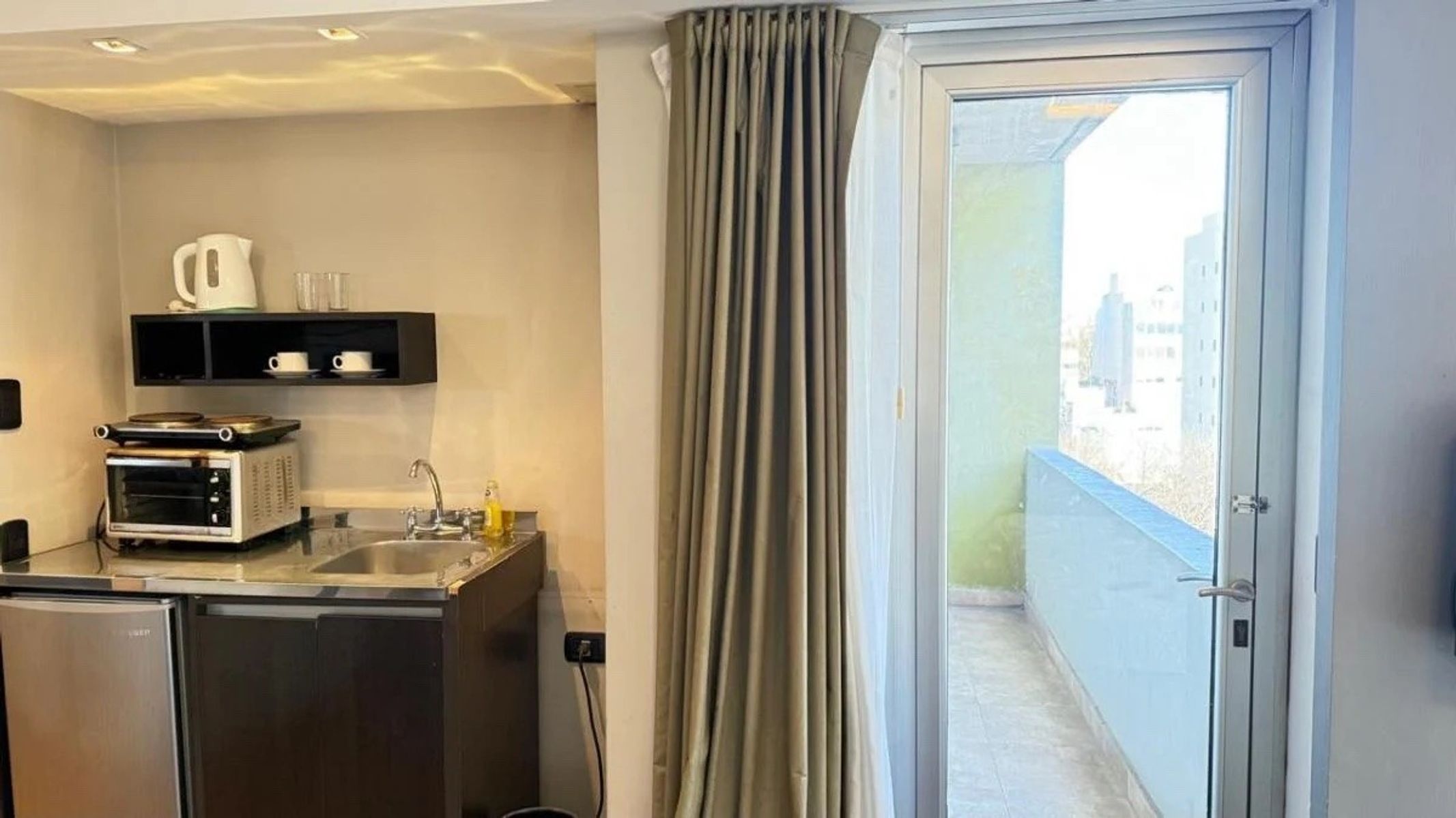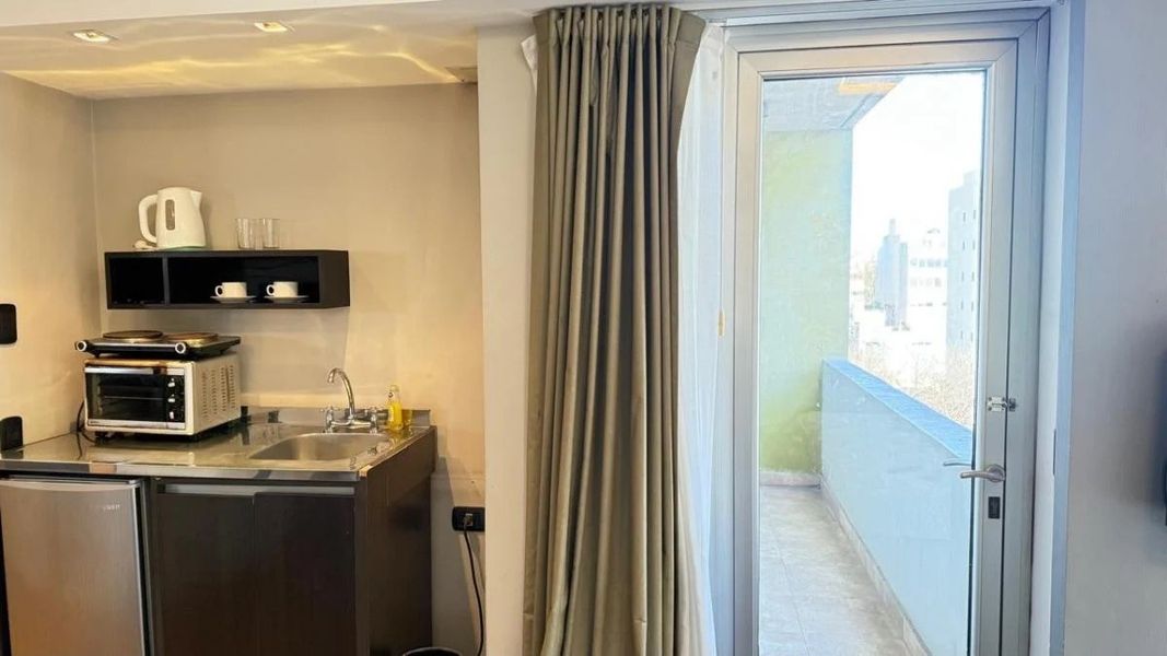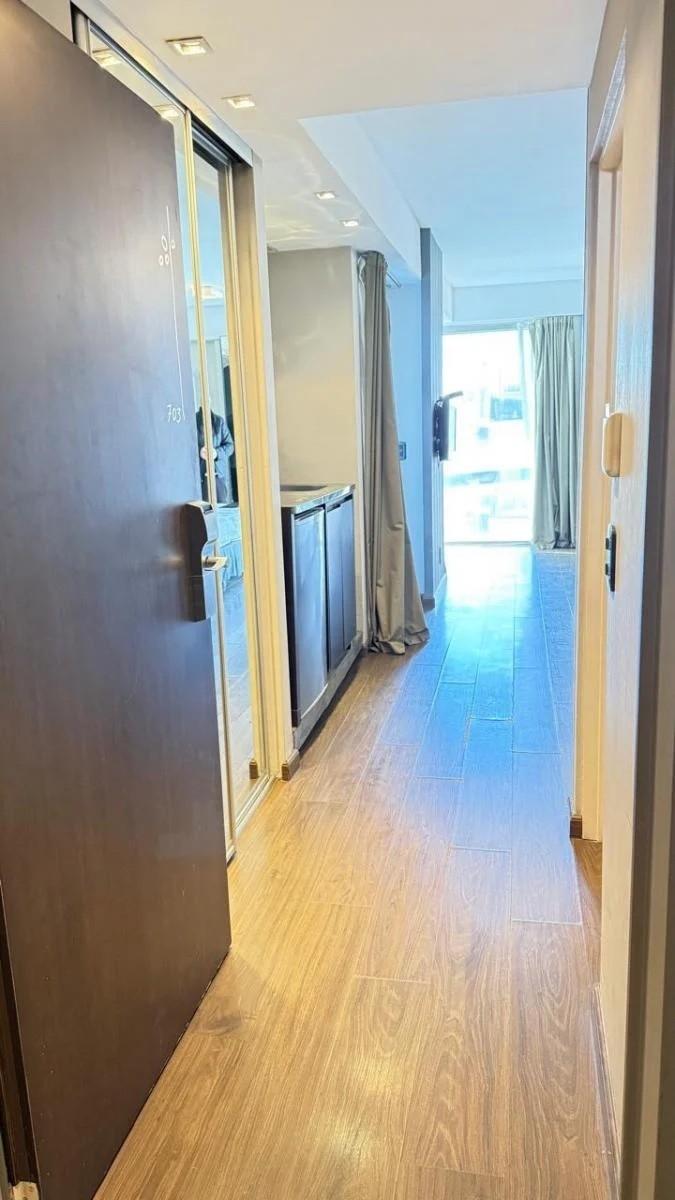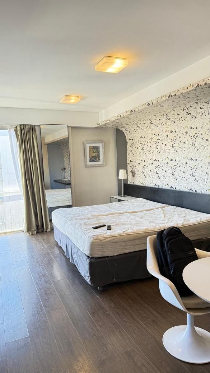 Dispone de cama King Size, amplio placard con caja de seguridad, baño completo y kitchenette equipada con anafe, microondas, heladera y muebles bajo mesada. Además, ofrece un área de comedor, espacio de estudio o lectura.